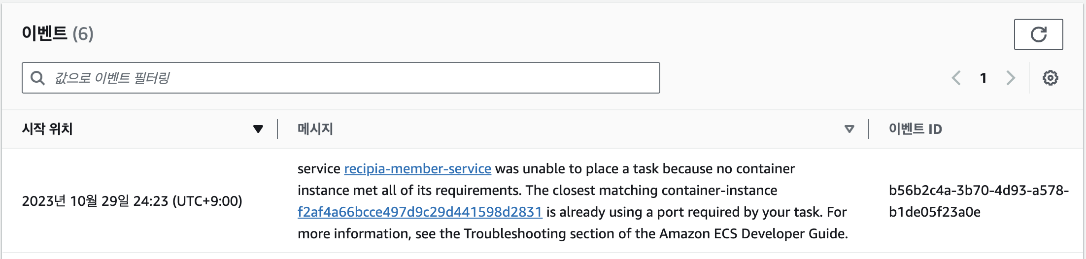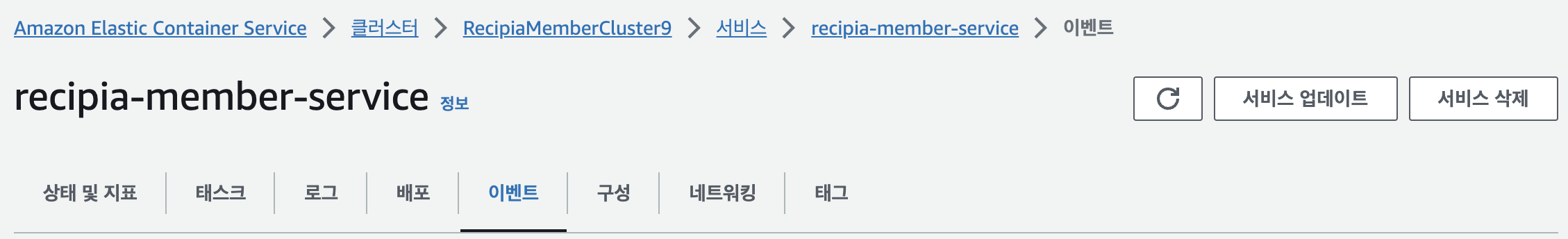 - “ECS클러스터 > 서비스”로 들어가서 상단의 “이벤트”를 눌러서 메시지를 확인했다.