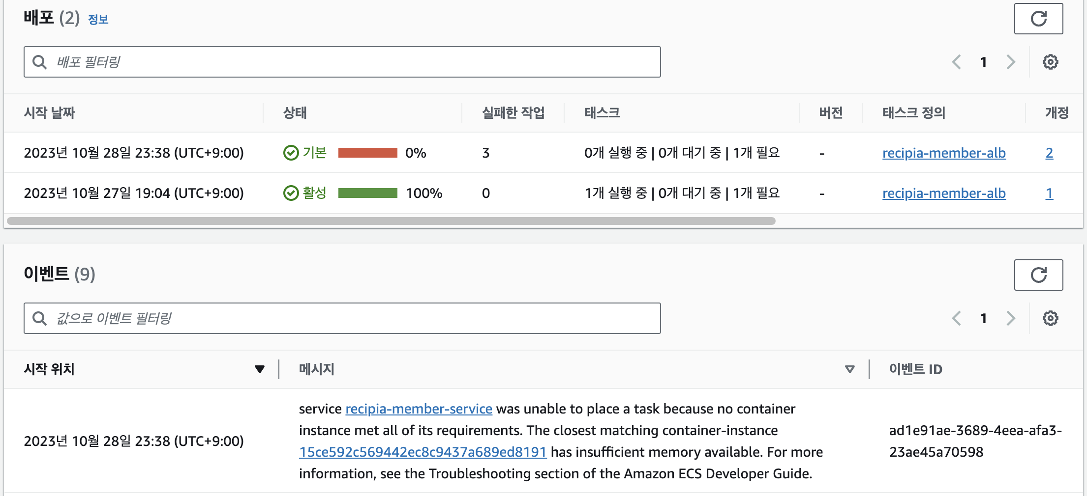 - 이벤트의 메시지를 확인해봤더니 다음과 같았다. "Amazon ECS가 recipia-member-service 서비스의 요구 사항을 충족하는 컨테이너 인스턴스를 찾지 못했음을 나타낸다." 특히, 가장 근접한 매치인 컨테이너 인스턴스 15ce592c569442ec8c9437a689ed8191는 필요한 메모리가 부족하여 태스크를 배치할 수 없다.