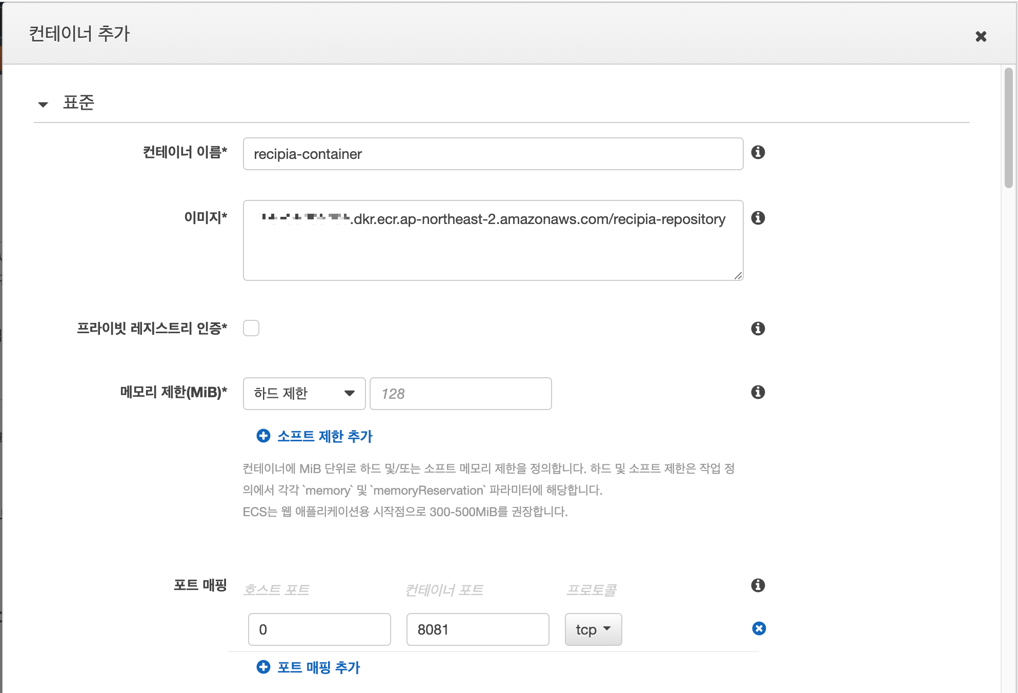 - 여기서 아래처럼 호스트 포트를 0으로 설정하고 컨테이너 포트를 8081로 설정하면 AWS ECS는 동적 포트 매핑을 사용하여 사용 가능한 호스트 포트를 자동으로 선택하고 할당한다.