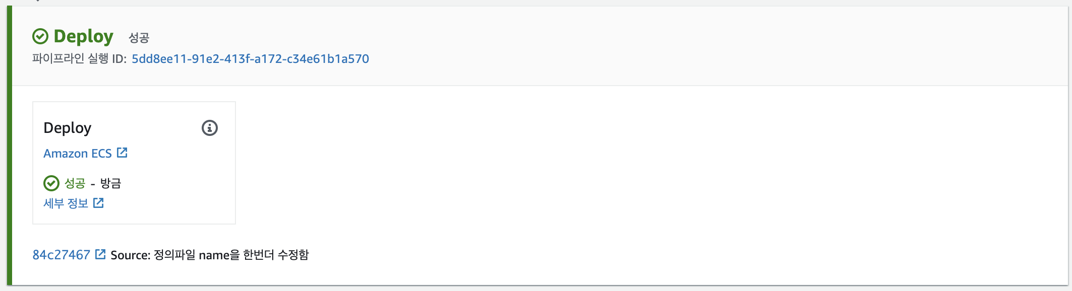 - 배포 성공후에 Codepipeline 대시보드에는 아래와 같이 표시되었다.
