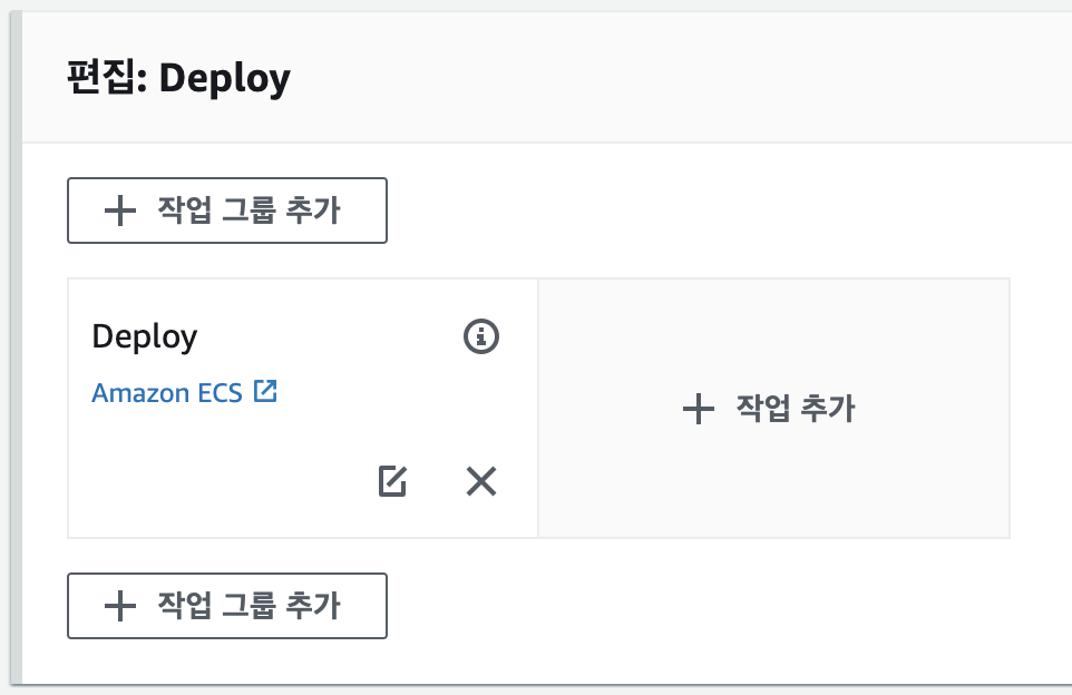- 참고로 Codepipeline을 작성할때 Deploy단계에서는 ECS의 클러스터와 서비스를 등록하게 되는데 만약 기존에 등록한 서비스의 이름이 지금 새롭게 생성하면서 바뀌었다면 CodePipeline에 들어가서 "편집"을 클릭해서 들어간다.