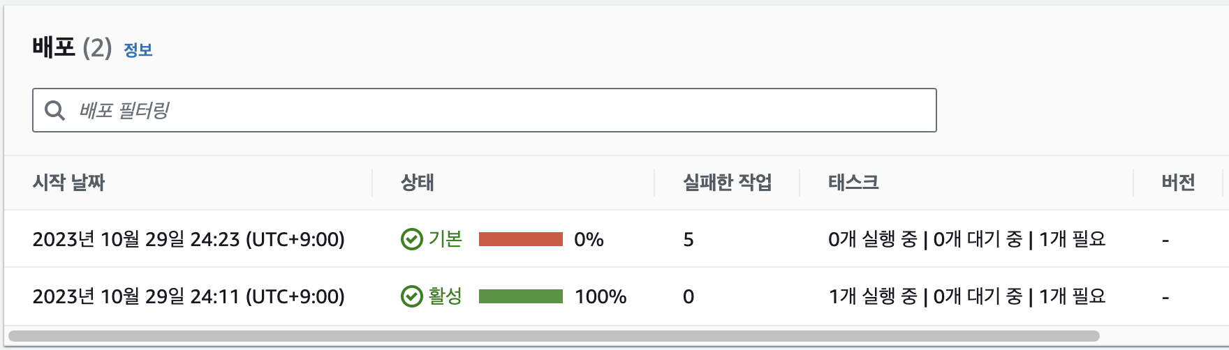 - 계속 진행중이 떠서 답답해서 ECS 클러스터에 들어가서 확인해 봤다. 아래와 같이 배포에서 실패한 작업이3번이었다.