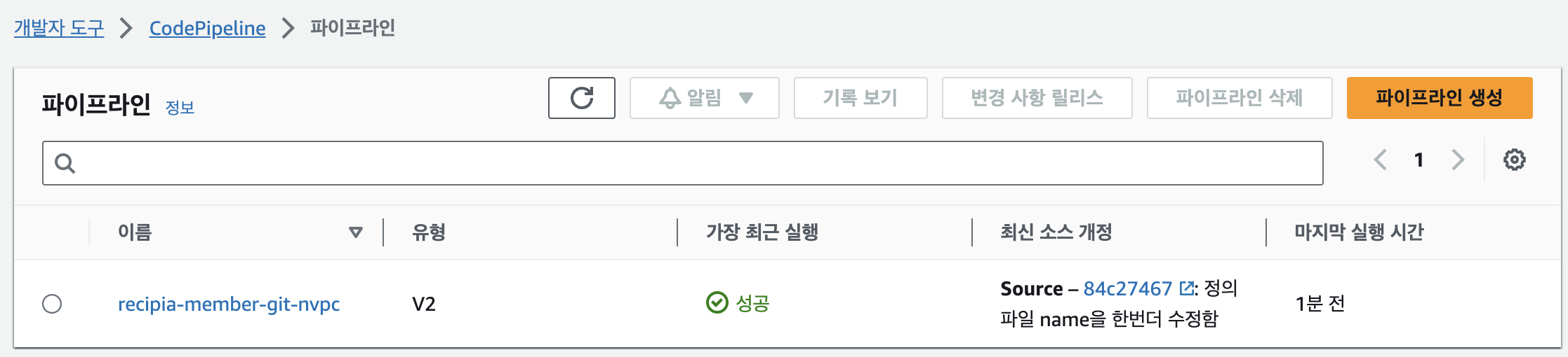 - 배포 성공후에 Codepipeline 대시보드에는 아래와 같이 표시되었다.