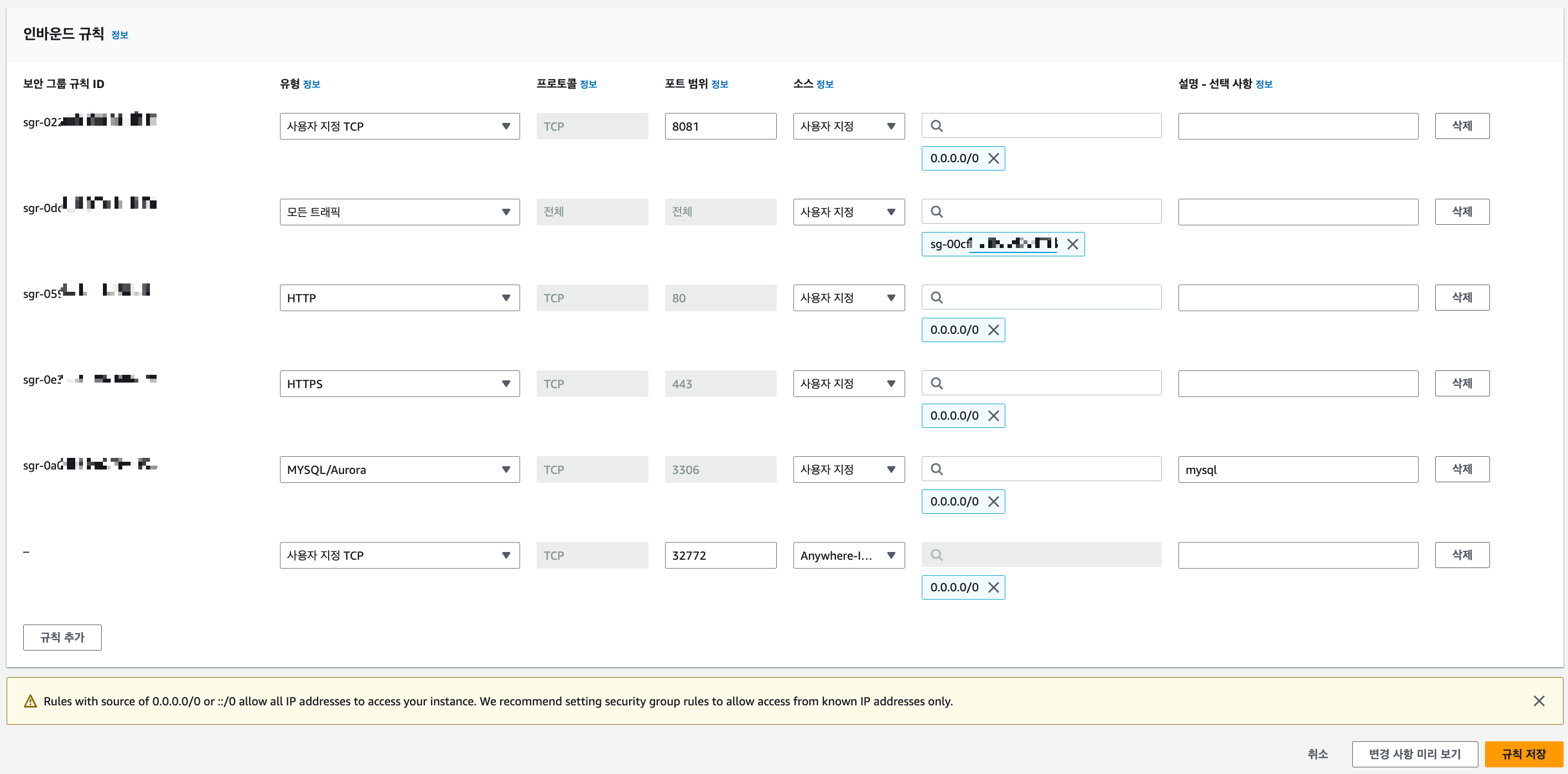 - 만약 ALB를 거치지 않고 EC2 인스턴스의 퍼블릭 IPv4 DNS 주소로 직접 접속하려면, EC2 인스턴스의 보안 그룹에서 "8081, 동적 랜덤 포트"를 열어주어야 접속이 가능하다.