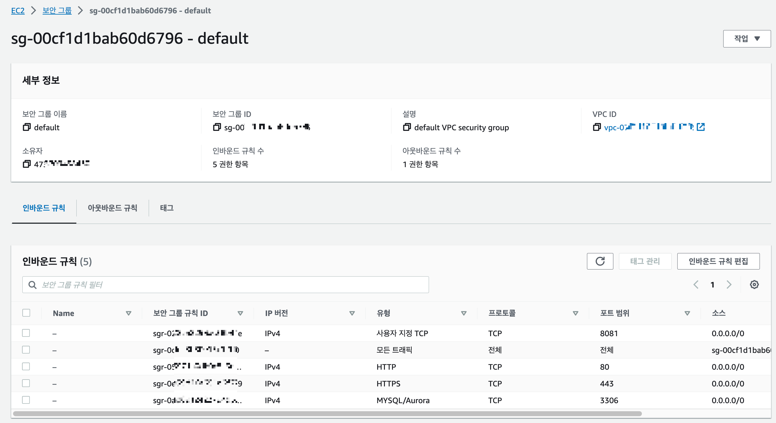 - "보안 그룹"으로 이동해서 설정해 준 default 보안 그룹을 선택해서 세부 정보로 들어왔다.