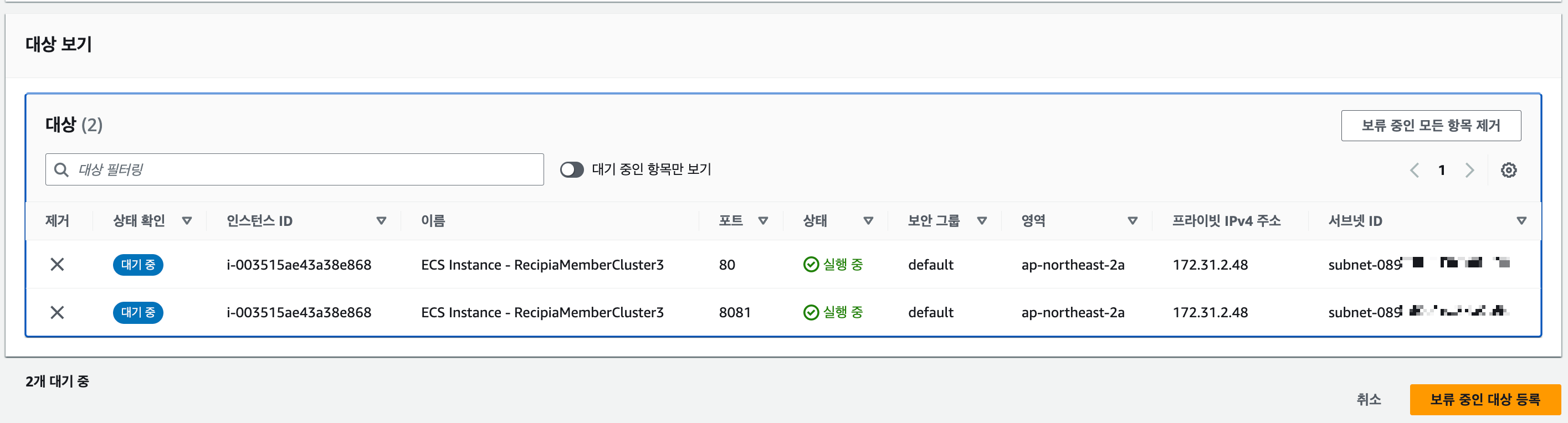 - 만약 위에서 대상 EC2를 추가를 했다면 아래처럼 보일텐데 내용을 확인 후에 "보류 중인 대상 등록" 버튼을 누르면 된다.