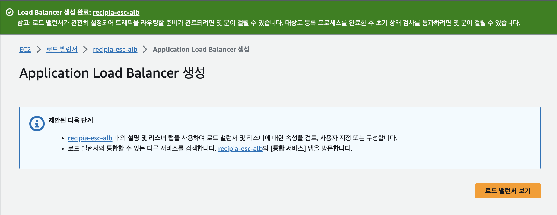 여기까지가 ECS에 적용하기 위한 ALB(로드 밸런서)를 생성하는 과정이었다. 생각보다 중간중간 만났던 오류가 많아서 더 오래걸렸던 ALB설정이다.