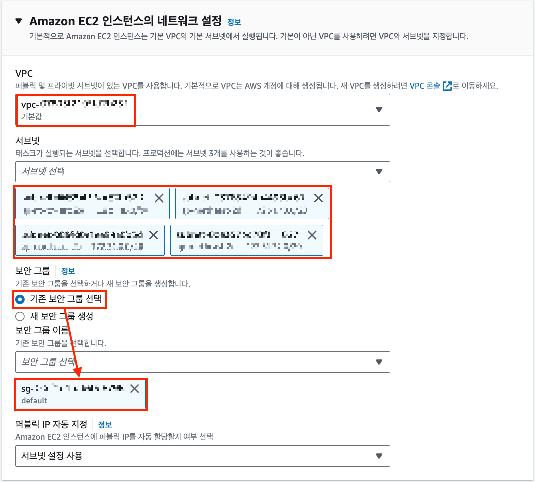 - VPC는 default를 선택했고 서브넷은 public subnet 4개를 다 선택했다.