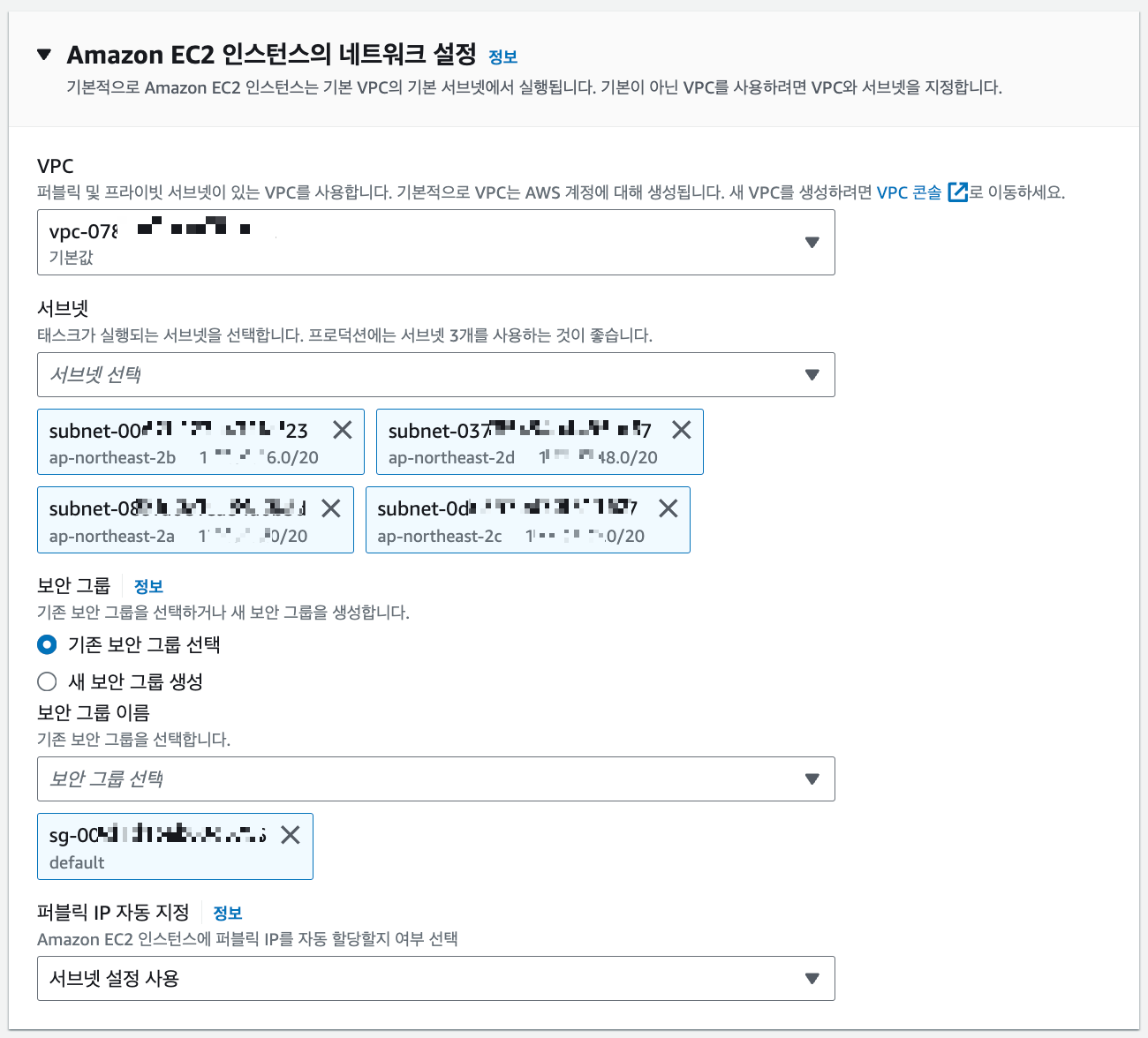 - 기존에 존재하던 VPC를 선택했고 서브넷도 전부 선택해 주었다.