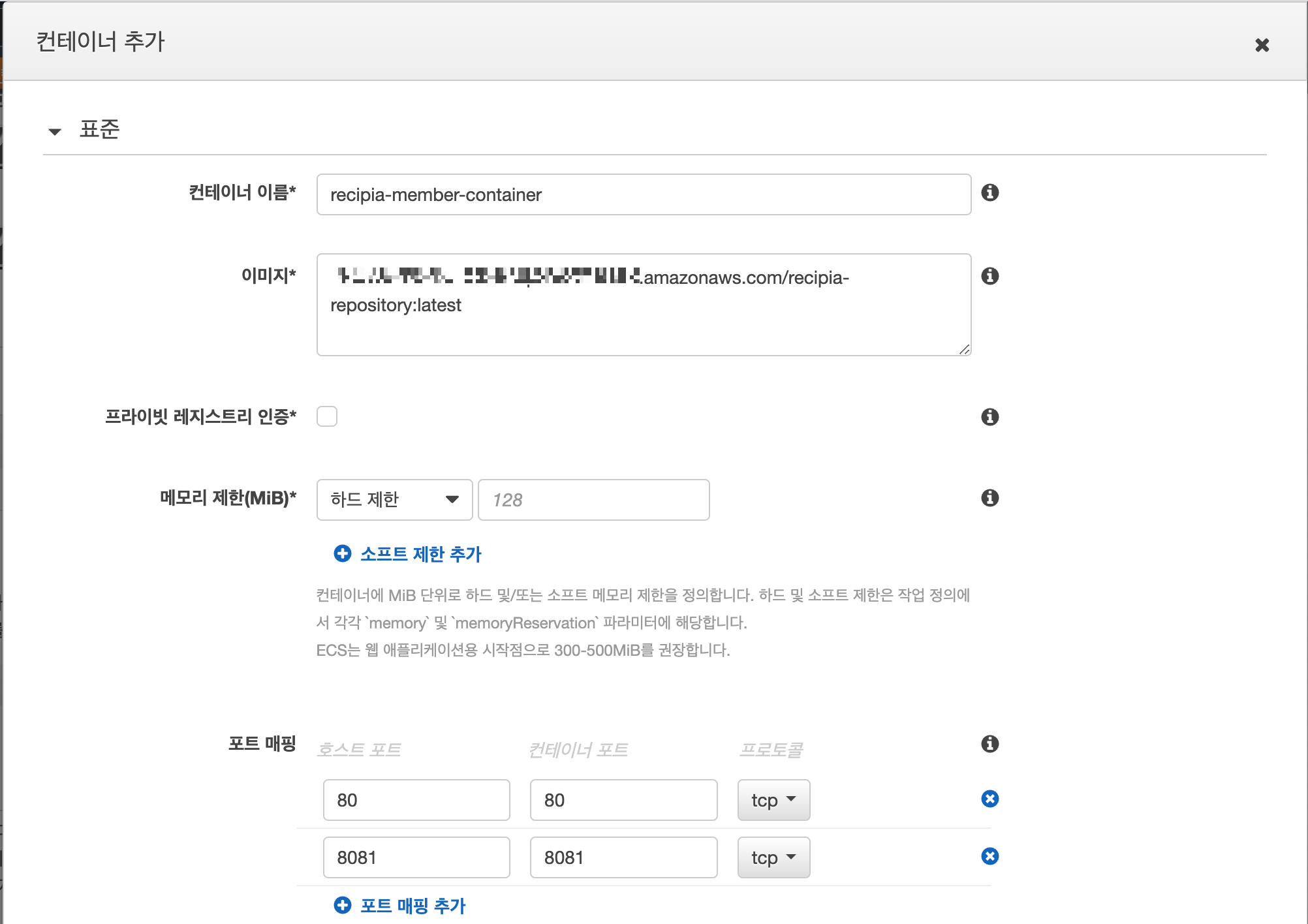 - 아래와 같이 컨테이너 이름을 적고 ECR에서 이미지의 URI를 복사해서 “이미지” 항목에 넣는다.