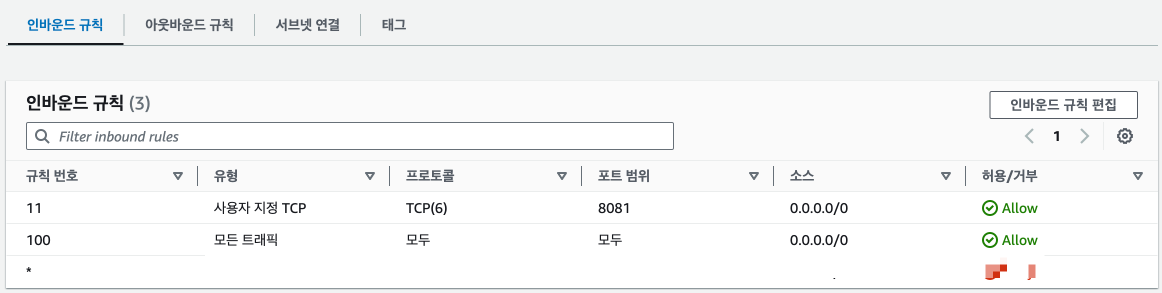 - 아래 사진을 보면 인바운드 규칙은 규칙 번호(내가 원하는 값으로 설정) 100번에 유형은 "모든 트래픽"으로 열어주었다. 소스는 0.0.0.0/0으로 설정해서 모든곳에서 들어올 수 있도록 설정했다.
