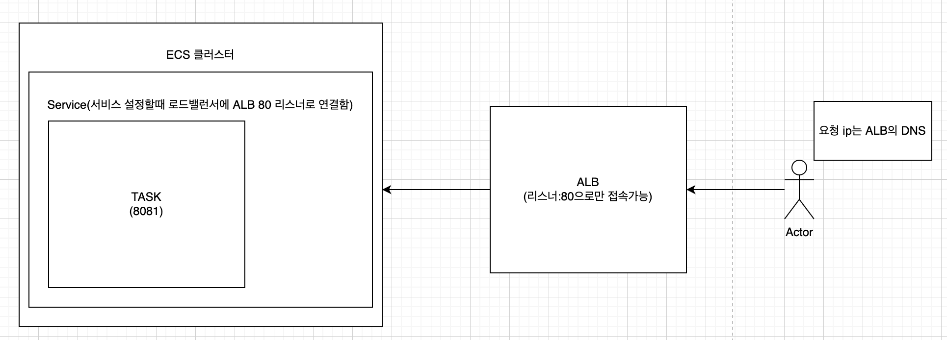 - 클라이언트는 ALB의 DNS 주소를 사용하여 요청을 보낸다. ALB는 이 요청을 ECS의 랜덤 호스트 포트로 라우팅하고, ECS는 이를 다시 컨테이너의 8081 포트로 라우팅한다. 이렇게 하면, 요청은 최종적으로 컨테이너의 8081 포트로 도달하며, 이 포트에서 동작하는 Tomcat 서버에 접속하게 된다.