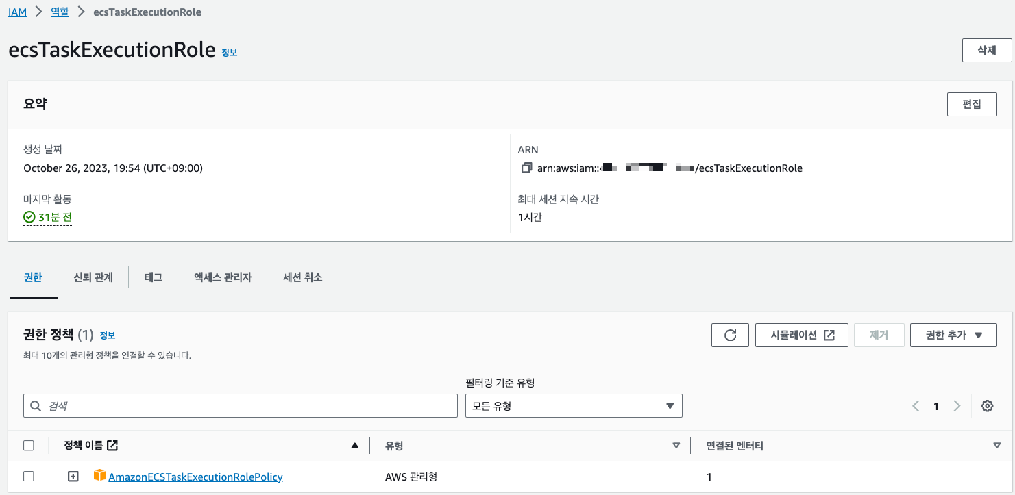 - 검색해서 나온 ecsTaskExecutionRole역할의 이름을 클릭해서 요약으로 들어가면 하단과 같은 페이지가 나온다.