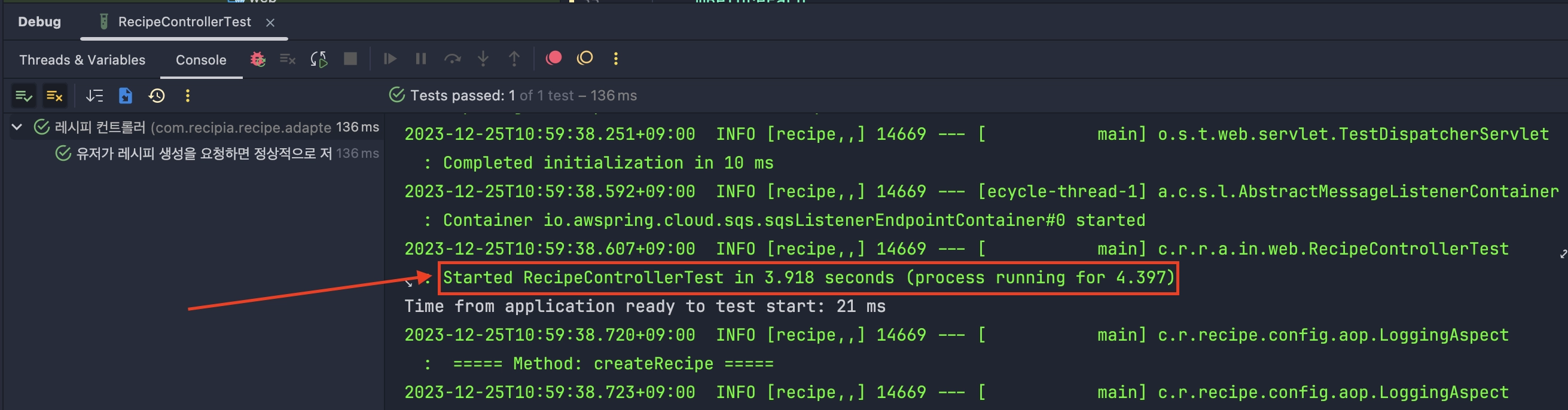 - 이 로그는 테스트 실행 시간과 관련된 주요 정보를 담고 있다. RecipeControllerTest 클래스의 테스트 실행이 완료되는 데 3.918초가 걸렸으며, 전체 프로세스는 4.397초 동안 실행되었다는 것을 나타낸다. 여기서 "전체 프로세스"란 테스트 환경 설정, 스프링 컨텍스트 로딩, 그리고 실제 테스트 실행까지의 전체 시간을 의미한다. 이는 테스트 클래스 실행에 필요한 전체 시간을 포함하는 것이다.