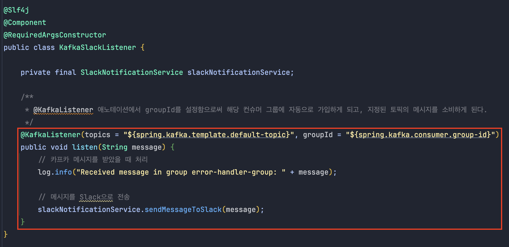 - 메시지를 produce 했으면 consume 하는 코드도 필요한데 같은 프로젝트 내부에 발행된 kafka 메시지를 consume 하는 KafkaListener 메서드를 작성했다. (slack을 바로 consumer로 설정할 수는 없다.)