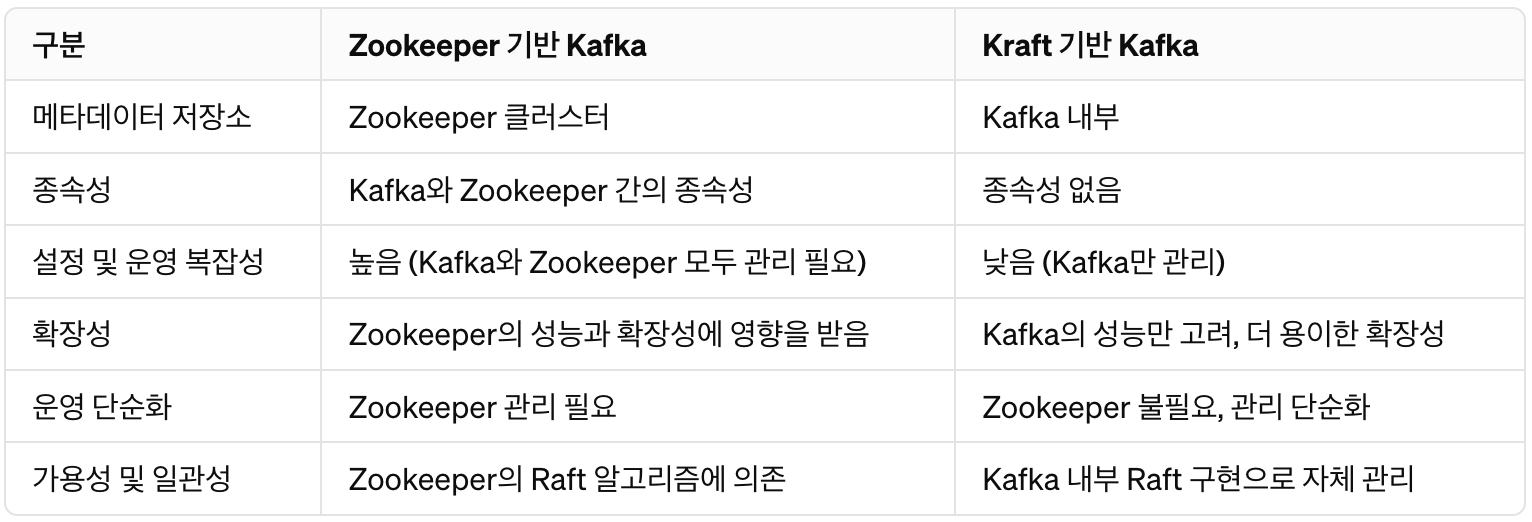 - Kraft 방식은 Kafka 내부의 Raft 합의 프로토콜 구현을 활용하여, 클러스터 메타데이터 관리의 종속성과 운영 복잡성을 줄이고 확장성을 개선한다.
