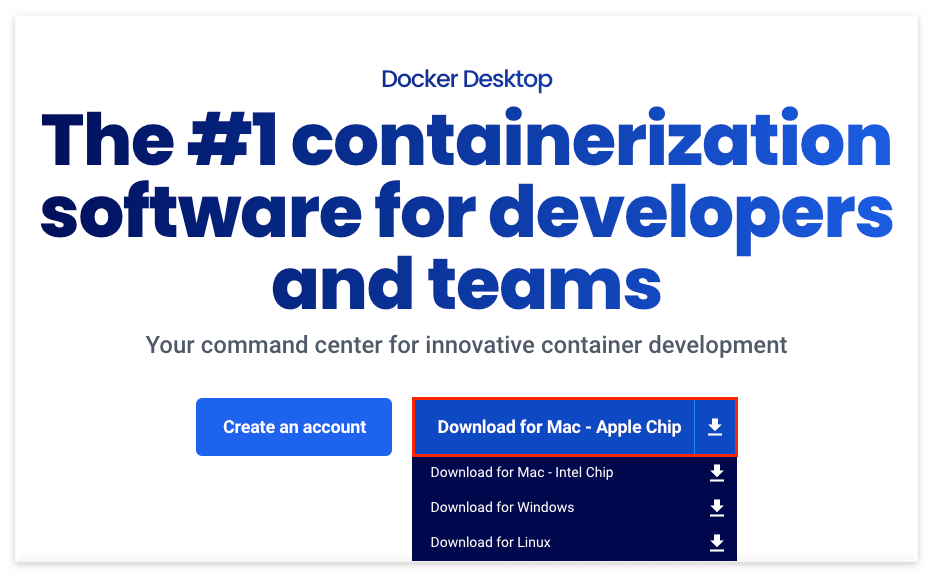 - Docker Desktop 메인 페이지에서는 아래와 같이 "Apple Chip"을 선택해서 다운로드할 수 있다.