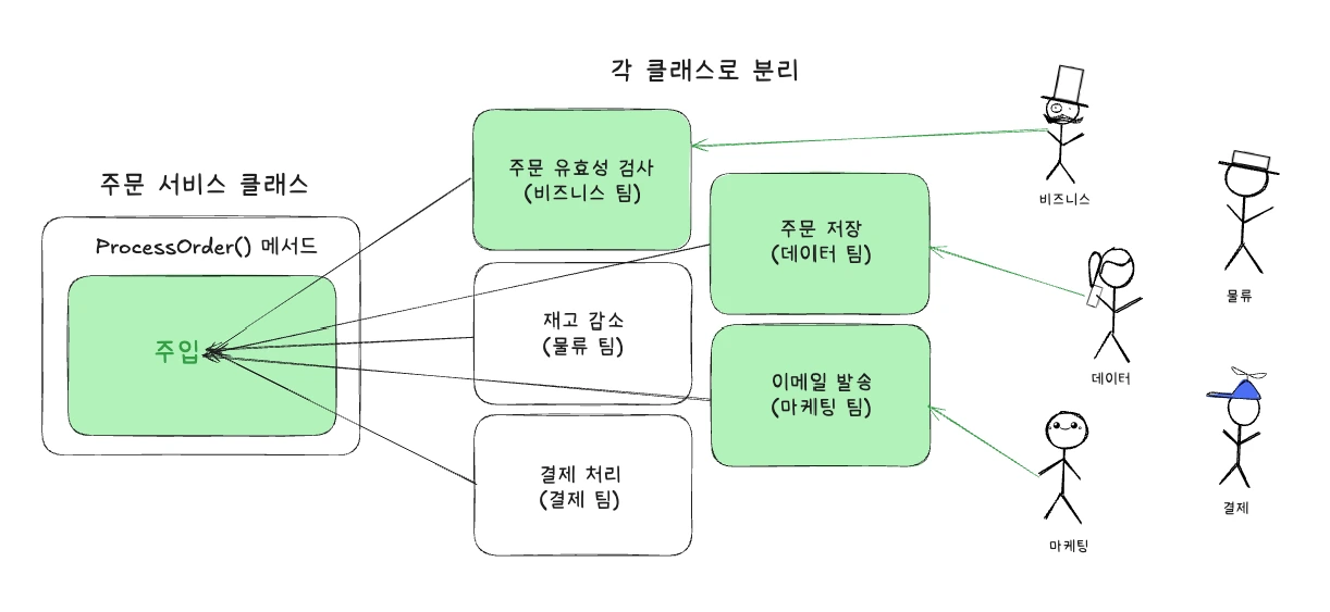 - 주문 서비스 클래스 안에서 수많은 액터들이 필요로 하는 작업이 진행되고 있습니다.