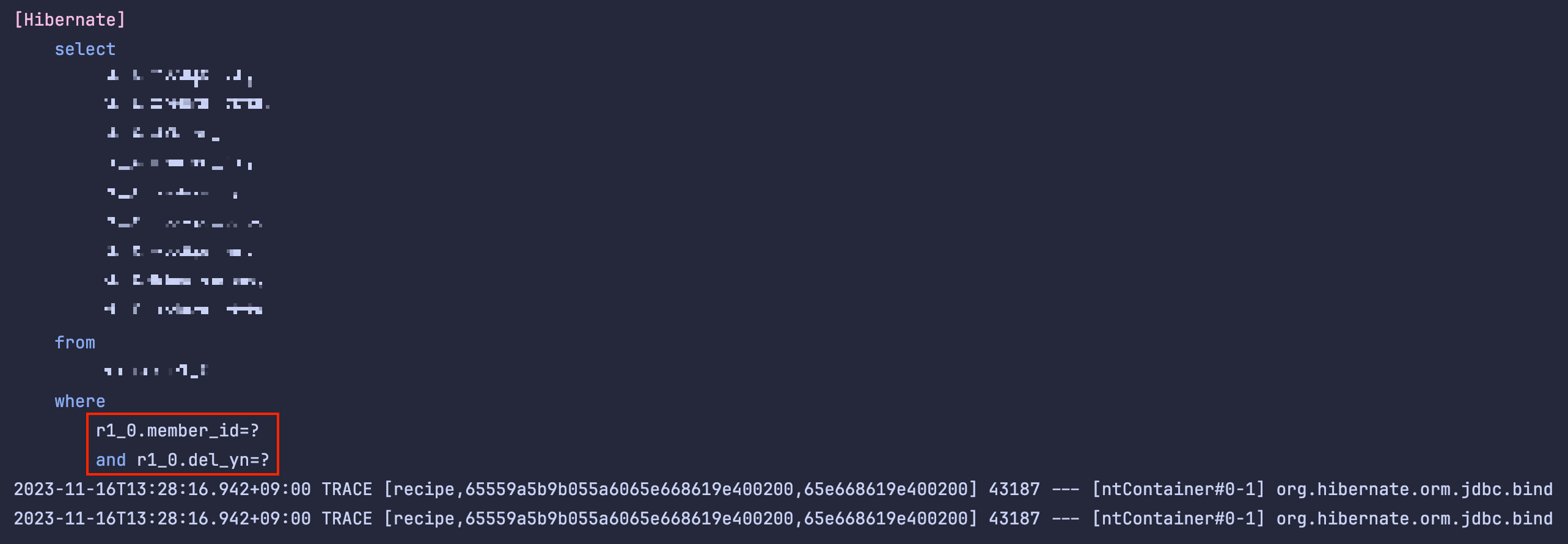 - 위의 사진은 적용 이전이고 아래는 적용한 후의 사진이다. JPA의 쿼리에 어떤 값이 들어갔는지 보이는 것을 확인할 수 있다.