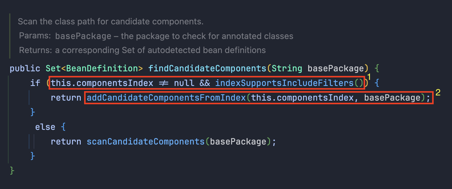 - 만약 componentsIndex가 존재하고, 인덱스가 includeFilters를 지원하는 경우 addCandidateComponentsFromIndex 메서드를 호출하여 후보 컴포넌트를 찾는다. 그렇지 않은 경우, scanCandidateComponents 메서드를 호출하여 스캔을 수행한다.