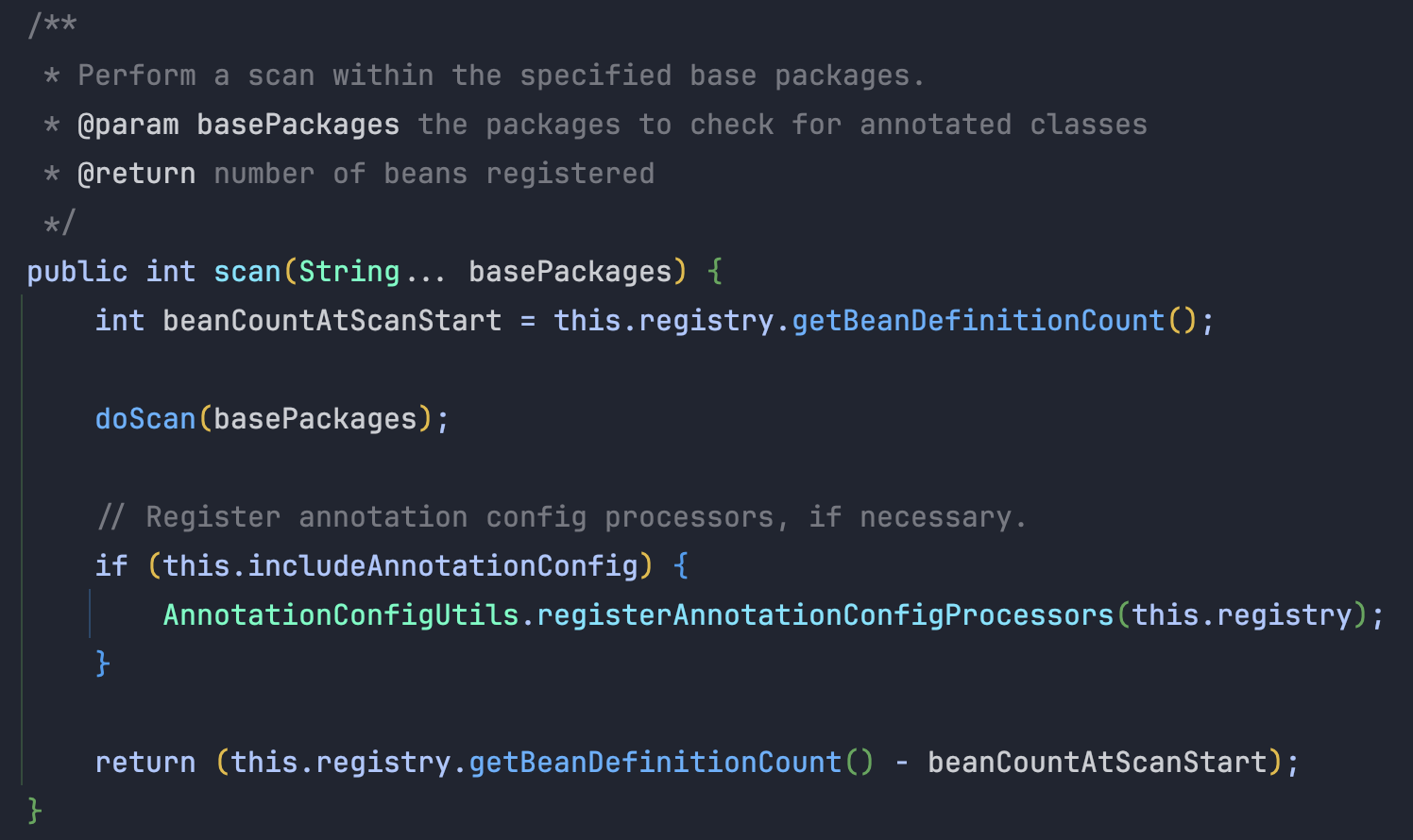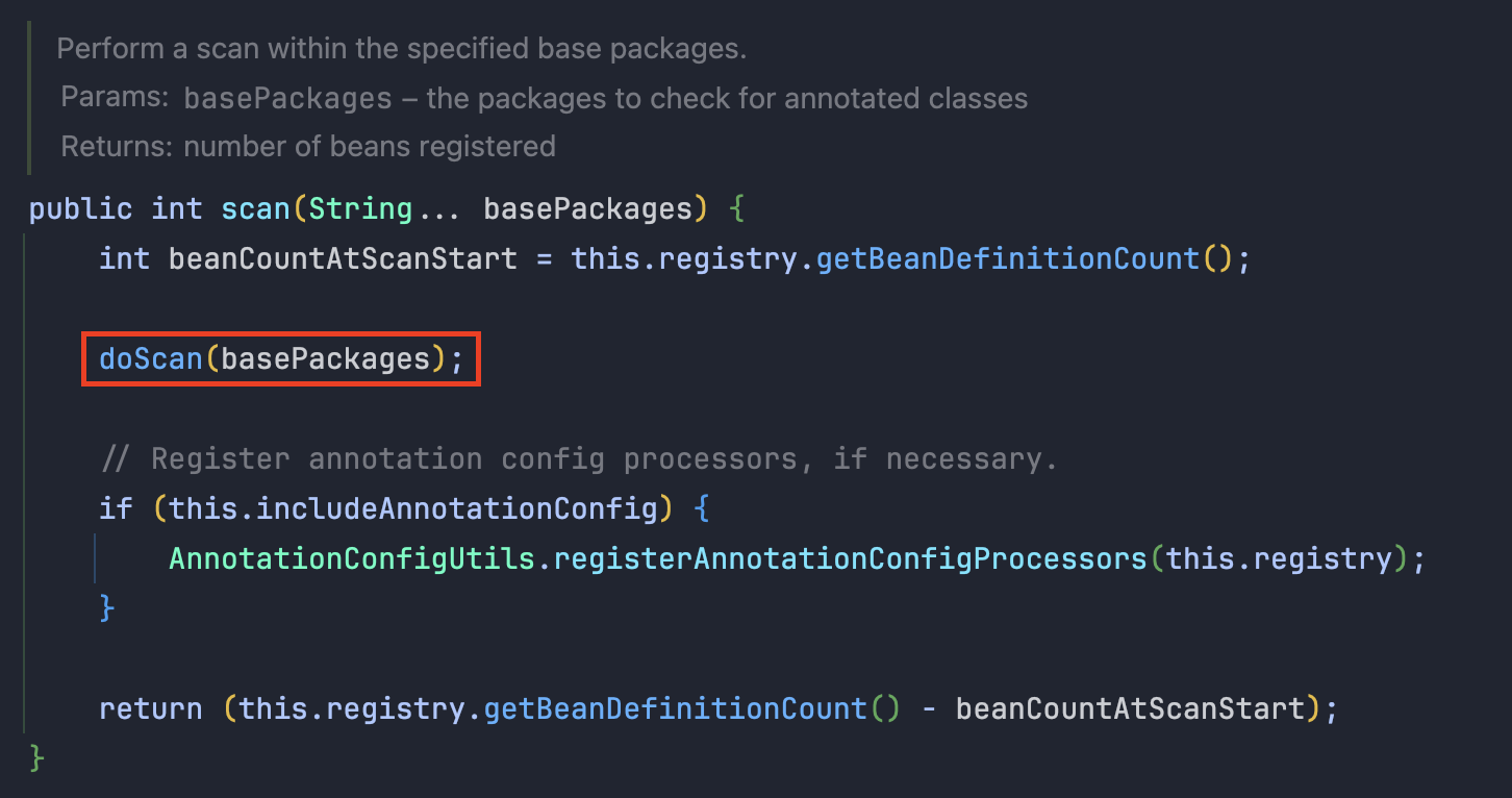 - doScan(basePackages) 메서드를 호출하여 주어진 패키지(들) 내의 클래스들을 스캔한다. doScan 메서드는 실제로 클래스 경로를 스캔하고 적합한 컴포넌트를 식별하는 역할을 한다.