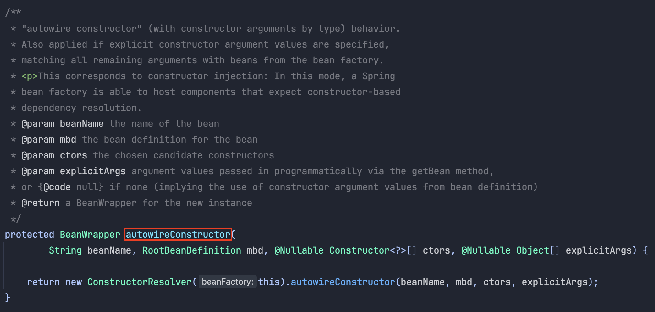 - autowireConstructor 메서드를 통해 생성자 주입을 수행한다. 빈의 생성자를 찾고, 필요한 의존성들을 ConstructorResolver 클래스에 선언된 resolveConstructorArguments 메서드를 통해 해결한 후, 이들을 생성자를 통해 주입하면서 빈 인스턴스를 생성한다.