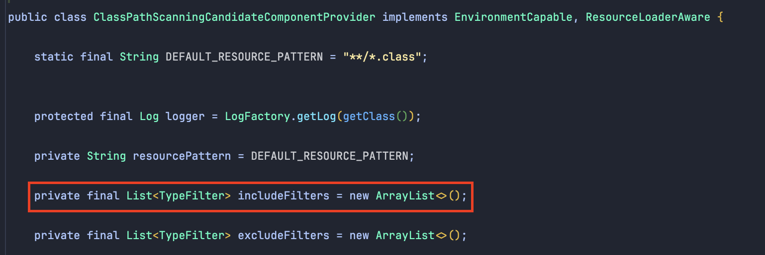 - includeFilters는 대체 어디에 선언되어있는지 찾아봤더니 addCandidateComponentsFromIndex 메서드가 선언되어 있는 ClassPathScanningCandidateComponentProvider 클래스 내부에 아래와 같이 멤버 변수로 includeFilters가 선언되어 있었다.