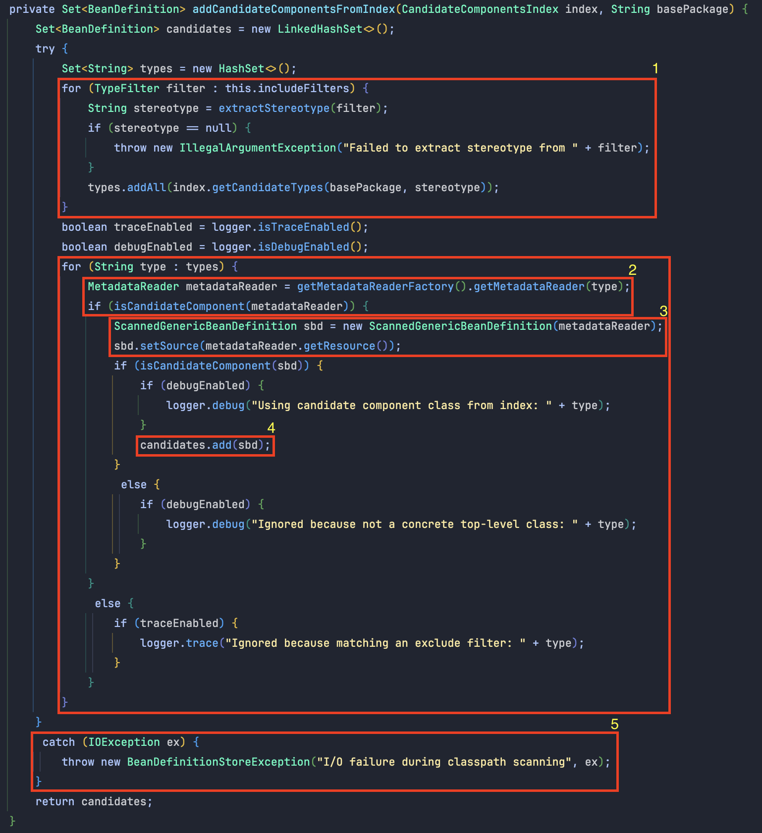 - addCandidateComponentsFromIndex 메서드는 CandidateComponentsIndex를 사용하여 가장 먼저 인덱스에서 해당 베이스 패키지에 대한 후보 컴포넌트 타입들을 가져온다. 이는 includeFilters에 정의된 타입 필터를 통해 수행된다. 각 필터는 특정 스테레오타입(예: @Component, @Service 등)과 관련된 클래스를 식별하는 데 사용된다.