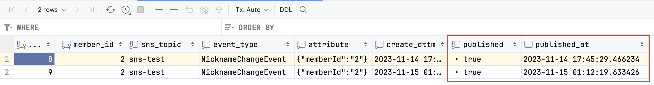 - 위의 코드를 보면 알 수 있겠지만 처음 DB에 이벤트 발행 여부를 기록할 때 published는 false로 저장한다. 이후 SNS -> SQS까지 잘 전달되면 SQS가 이 published 컬럼을 true로 변경시켜 줄 것이다.(이런 식으로 이벤트가 잘 보내졌는지를 검증한다.)