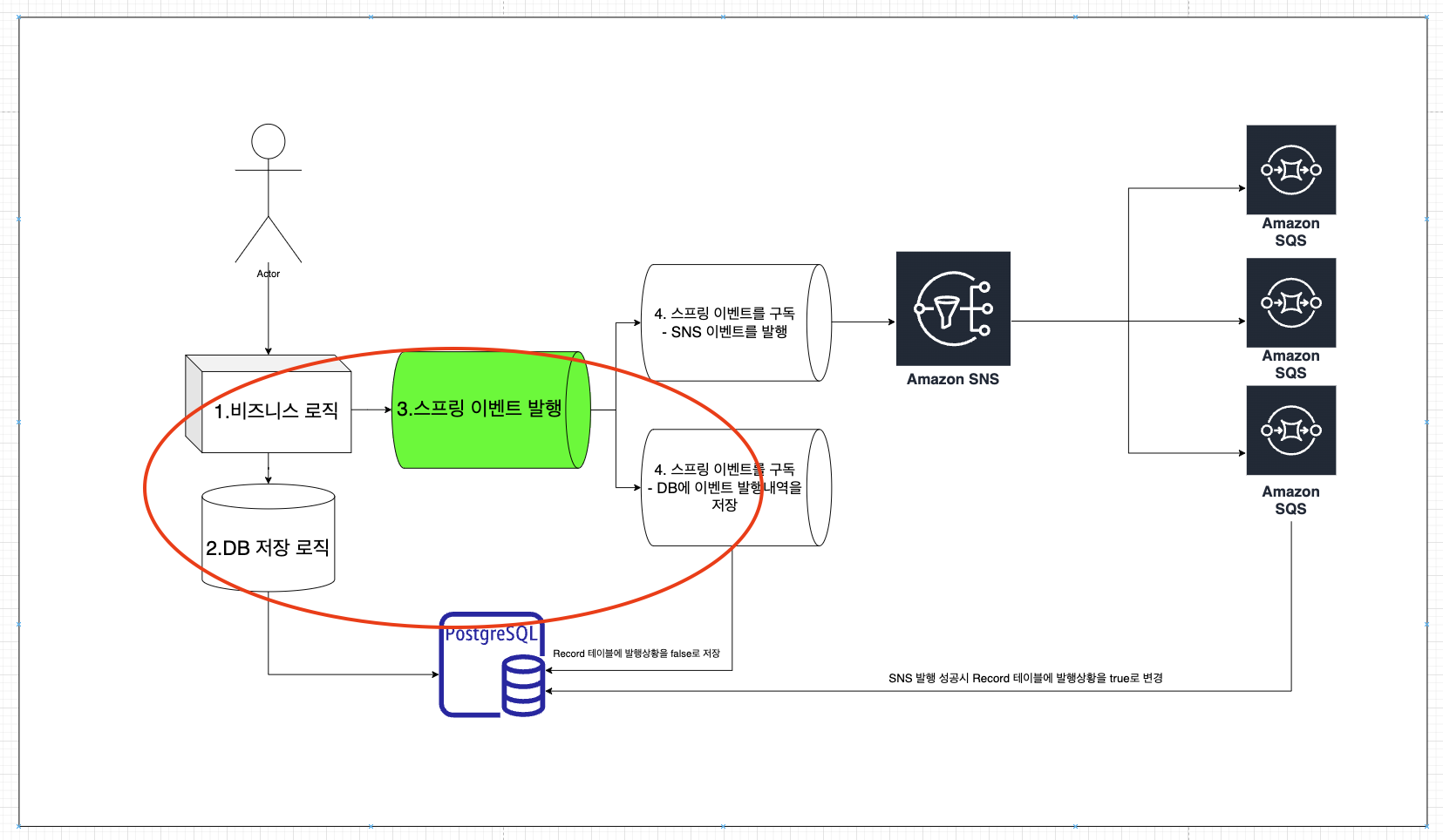 - 중요한 건 이 상황에 내가 빨간 원으로 그려놓은 부분(DB에 저장하는 부분)은 하나의 트랜잭션으로 묶여있다는 사실이다. 원안에 들어있지 않은 SNS 이벤트를 발행하는 스프링 이벤트 리스너(구독자)는 아래의 원 내부의 코드가 이상 없이 동작하여 트랜잭션이 완료되어 DB에 내용이 commit 되면 동작하도록 이벤트 리스너 어노테이션에 AFTER_COMMIT을 설정해 주었다.