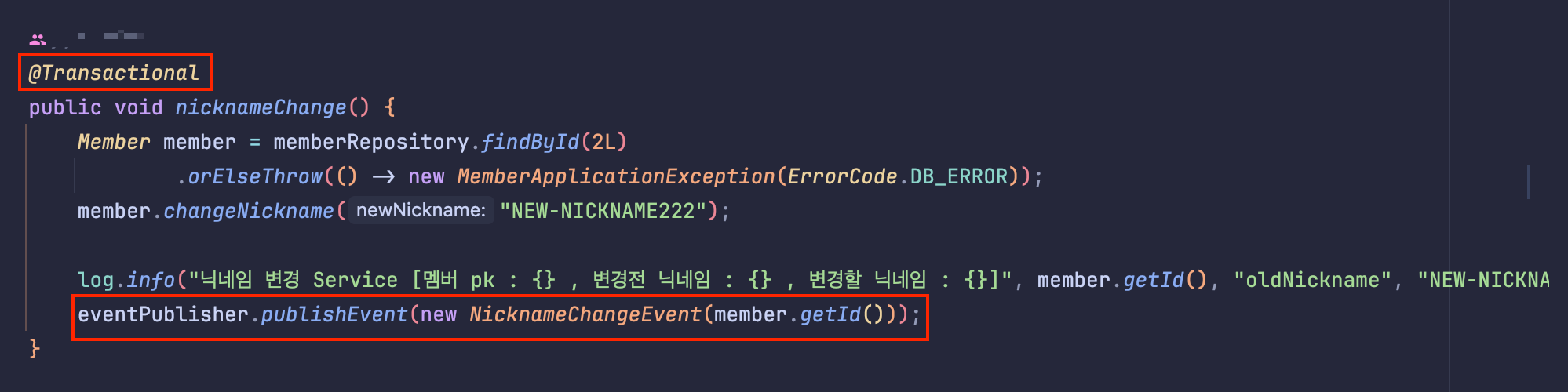 - 아래의 코드는 DB에 변경된 닉네임을 저장하고 Spring event를 발행하는 서비스 계층의 메서드다.