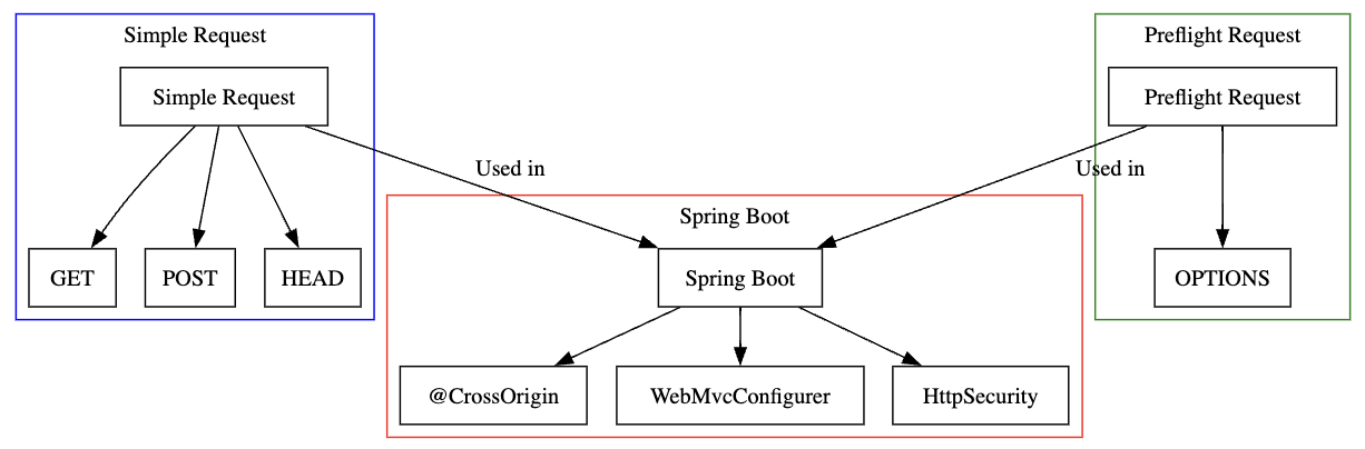 - 아래 그림은 Simple Request와 Preflight Request, 그리고 이들이 Spring Boot에서 어떻게 사용되는지를 나타낸다.