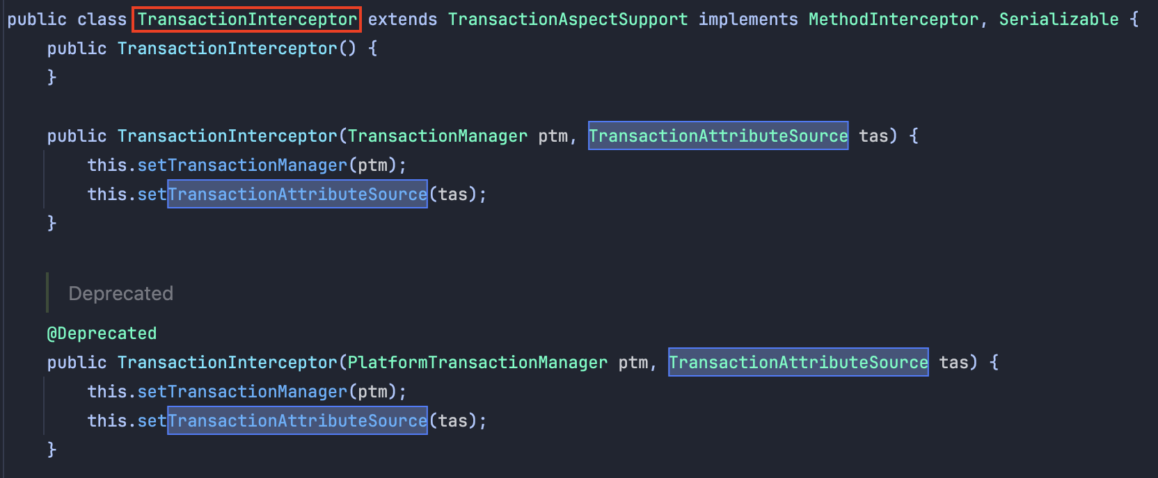 - TransactionInterceptor는 스프링 프레임워크의 AOP(Aspect-Oriented Programming, 관점 지향 프로그래밍)를 이용해서 트랜잭션 관리를 하는 중요한 부분이다.