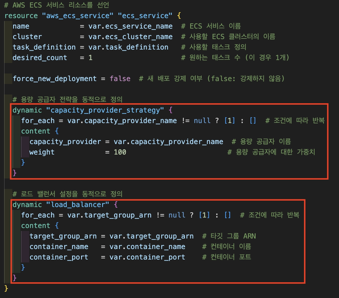- 내가 작성한 테라폼 코드를 보면 'capacity_provider_strategy'와 'load_balancer'에 대한 설정이 다이나믹 블록으로 정의되어 있다. 이렇게 함으로써, 해당 변수들이 'null'이 아닐 때만 해당 설정 블록을 포함시키는 조건부 구성이 가능해진다.