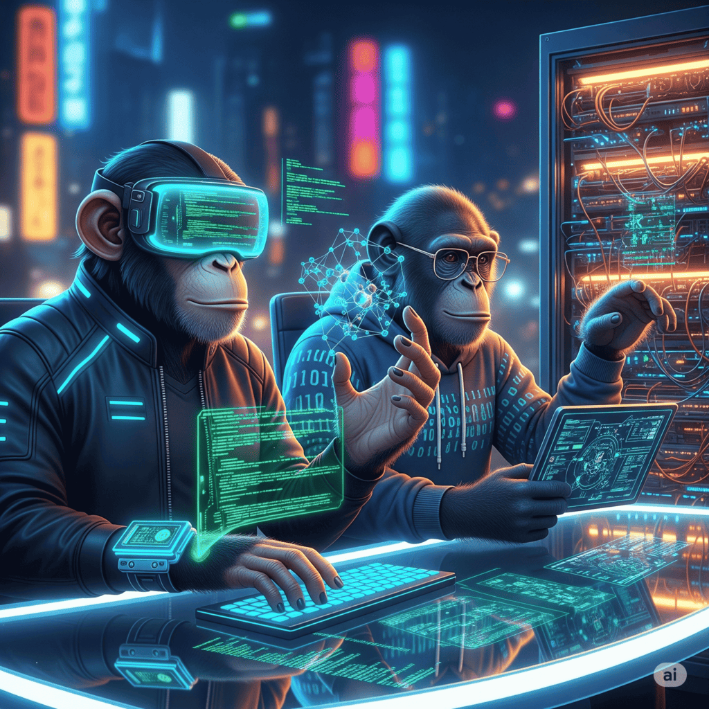저희는 즉시 프로젝트 팀 빌딩을 진행했고 팀의 컨셉도 정했습니다. 저희를 아직 세상의 판도를 뒤흔들 도구를 '발견 중'인 존재라는 의미를 담아 원숭이를 마스코트로 삼았고 프로젝트명 또한 Monkeys로 정했습니다. 팀의 마크(아이콘)는 AI에게 부탁했더니 원숭이가 AI와 컴퓨터 도구를 발견한 뒤 신나서 무언가를 만들고 있는 것으로 만들어주었습니다.