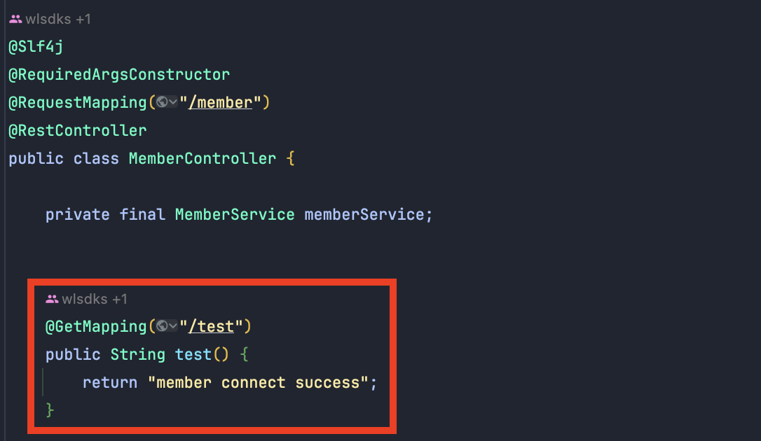 - 여기서는 2가지를 자세히 봐야한다. 먼저 "상태 검사 경로"이다. 이 경로는 내 SpringBoot 내부에 컨트롤러 맵핑이 존재하는 경로를 적어준 것이다. (하단의 이미지처럼 컨트롤러 코드를 작성했다.)